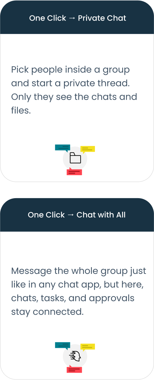 There’s no private chat in groups, no tasks, no approvals, no team performance tracking, and no file versioning, collaboration is limited. Arkchat keeps the same simplicity, but adds all of it for real teamwork.